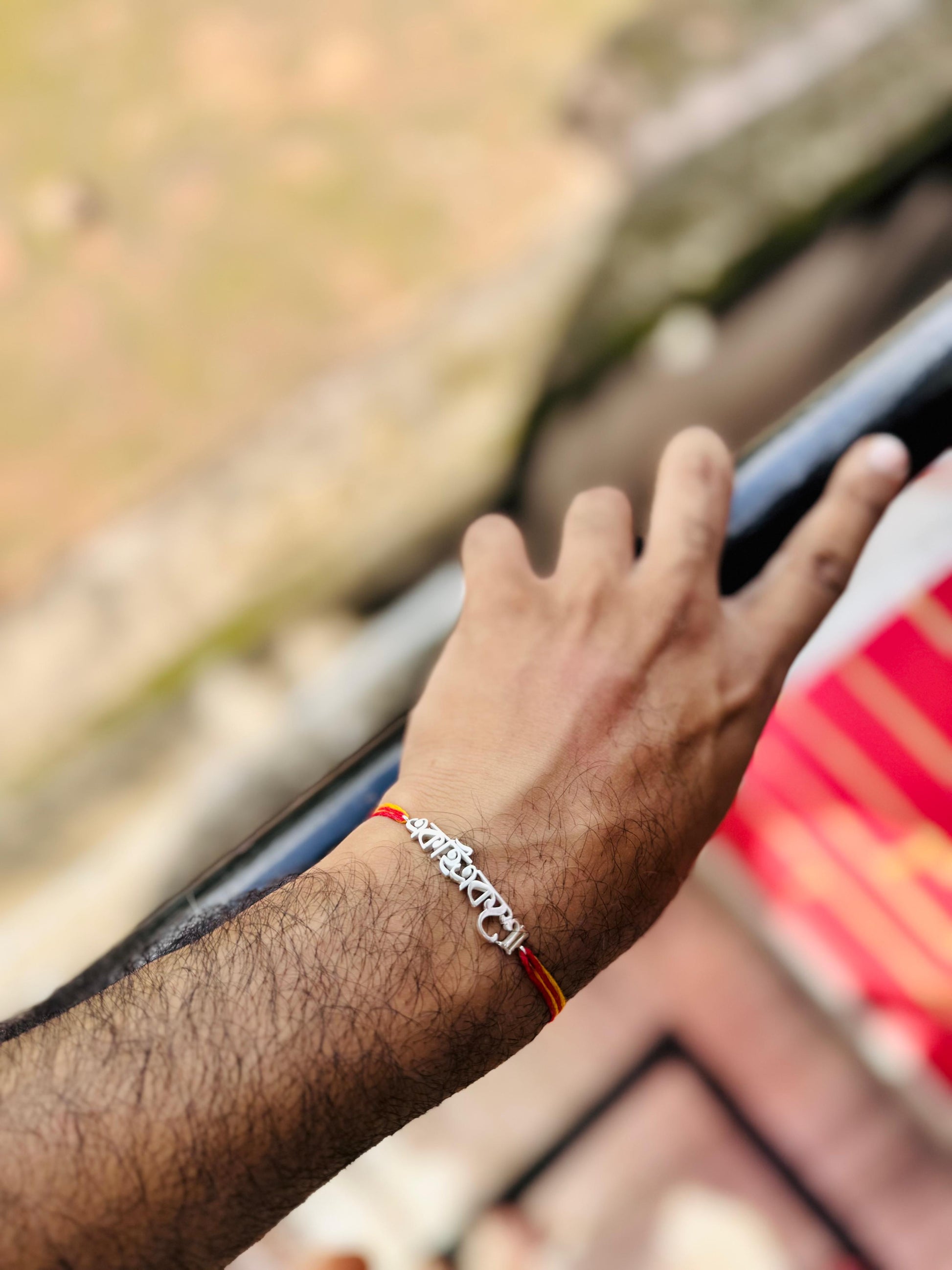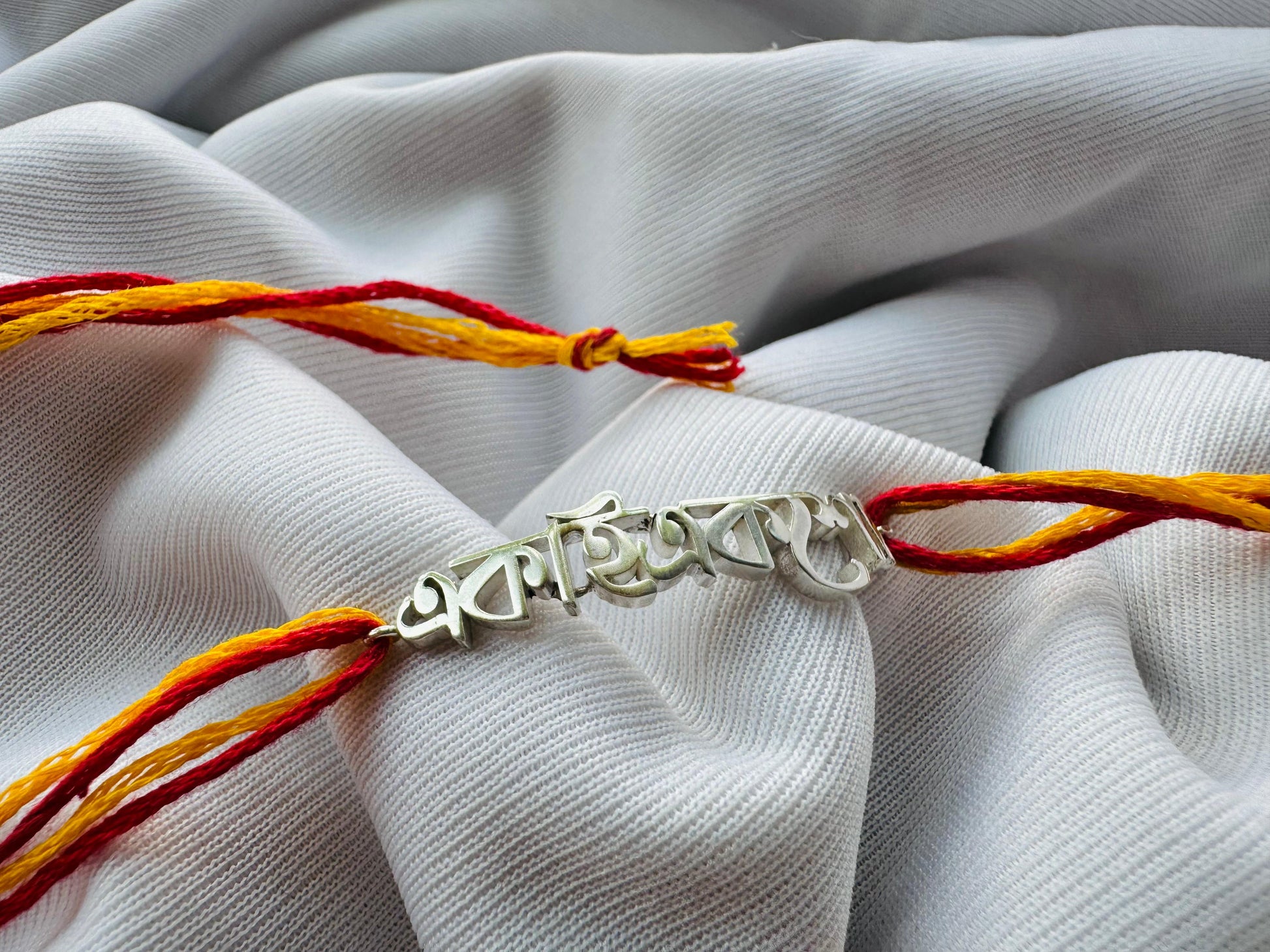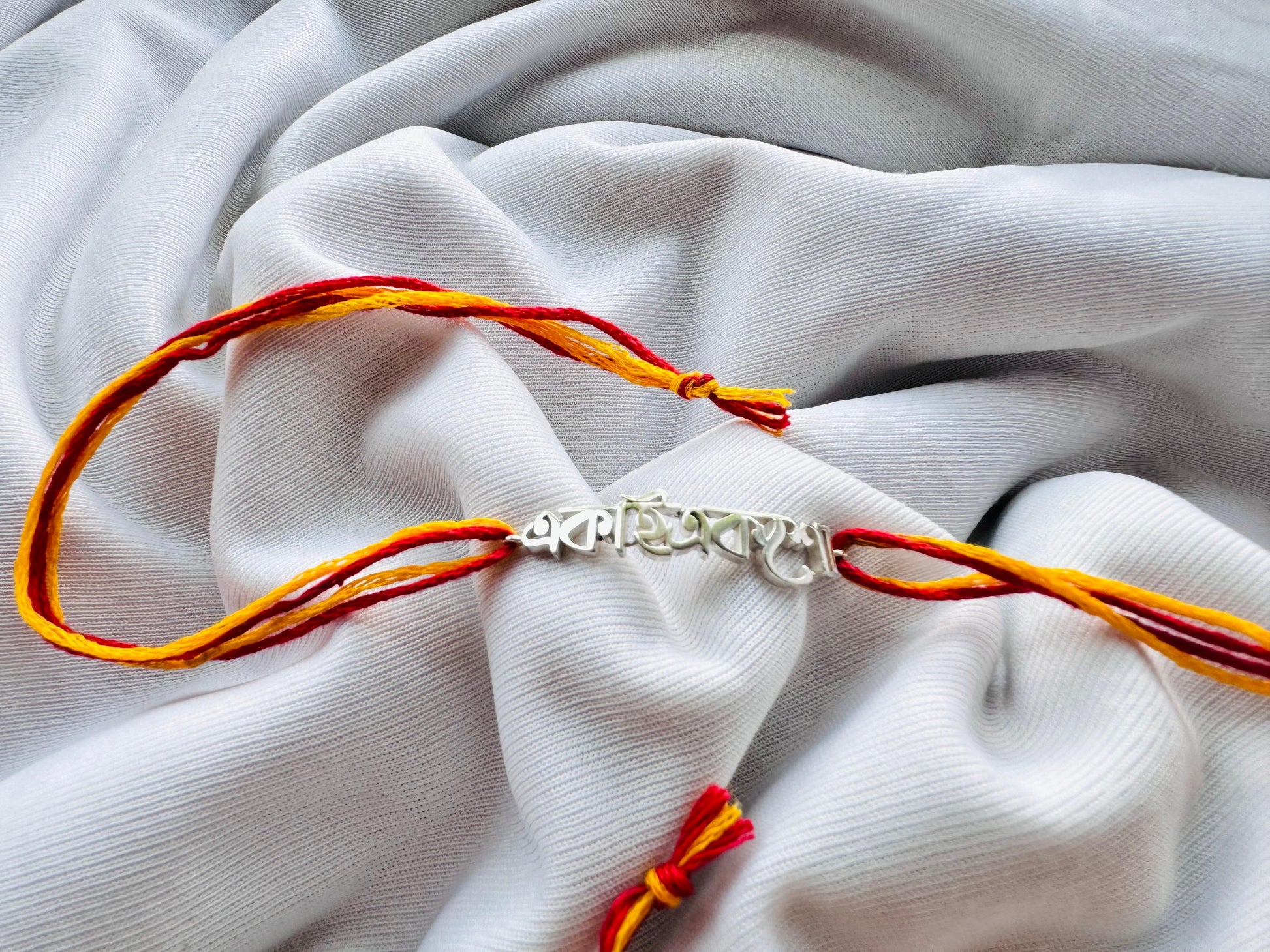 This elegant “Ekai Aksho” rakhi, handcrafted in pure silver, features intricate Bengali calligraphy symbolizing unity and strength. Paired with vibrant red and yellow threads, it blends tradition with artisanal charm—perfect for celebrating the bond of Raksha Bandhan with timeless style and meaningful expression. A true handcrafted heirloom.