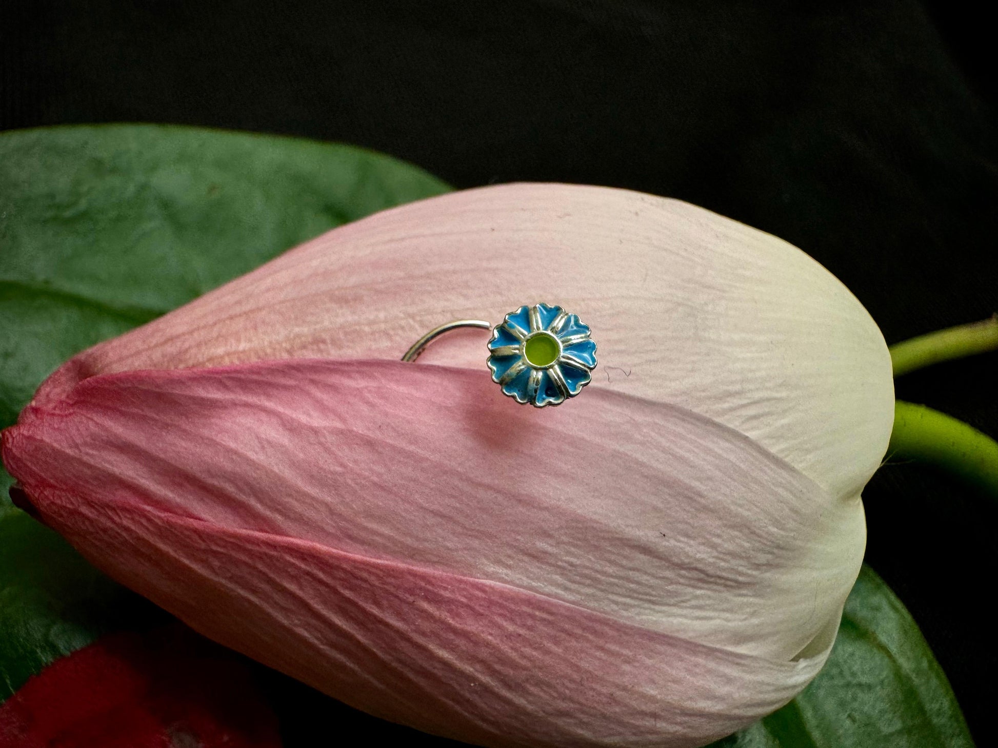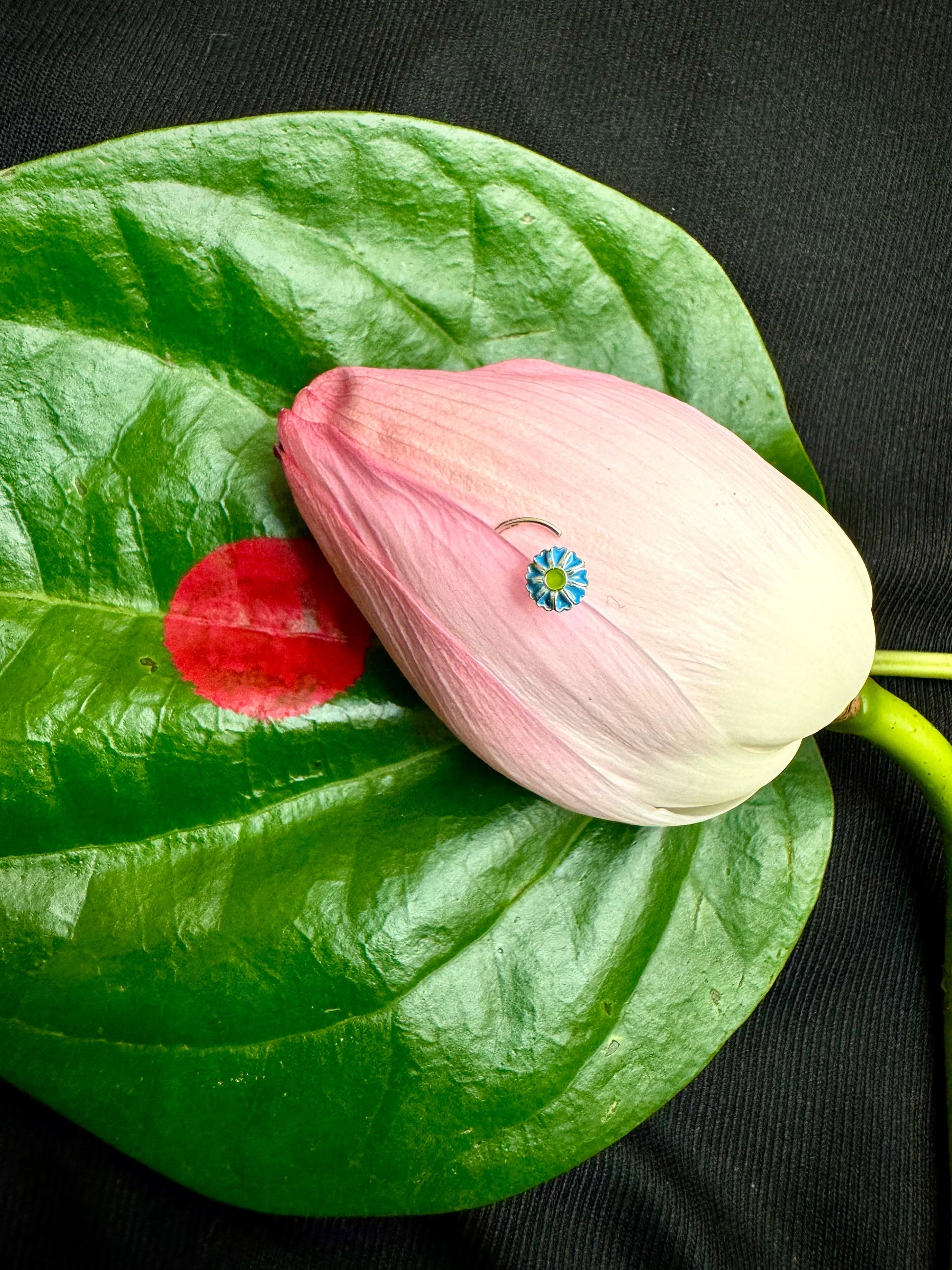 The Aparajita nosepin is a beautifully crafted piece featuring intricate enamel work with delicate blue petals surrounding a vibrant green center. This design captures the essence of the Aparajita flower, a symbol of beauty and devotion, lending a fresh and elegant touch to your look. Expertly made from BIS hallmarked silver, this nosepin ensures both authenticity and lasting quality. Its refined craftsmanship and meaningful design make it a perfect accessory for those who appreciate subtle artistry and cultural significance in their jewelry collection.