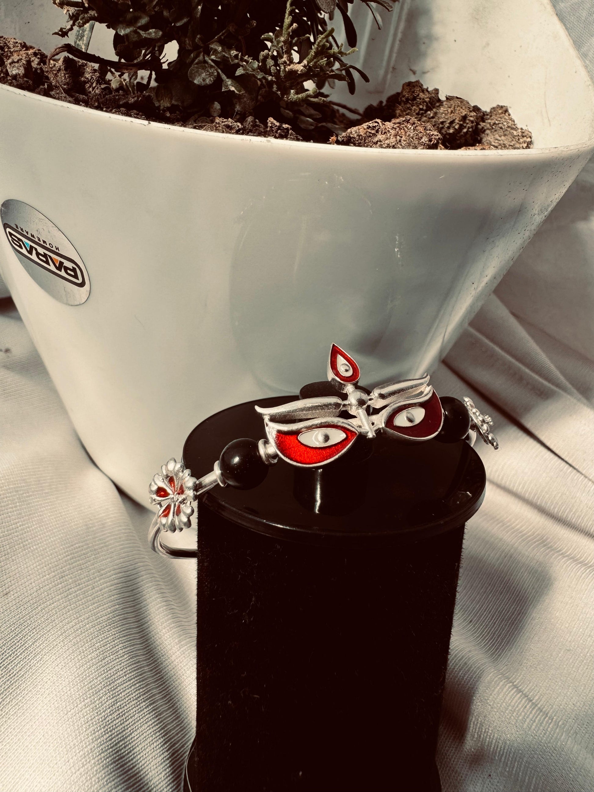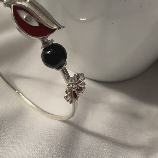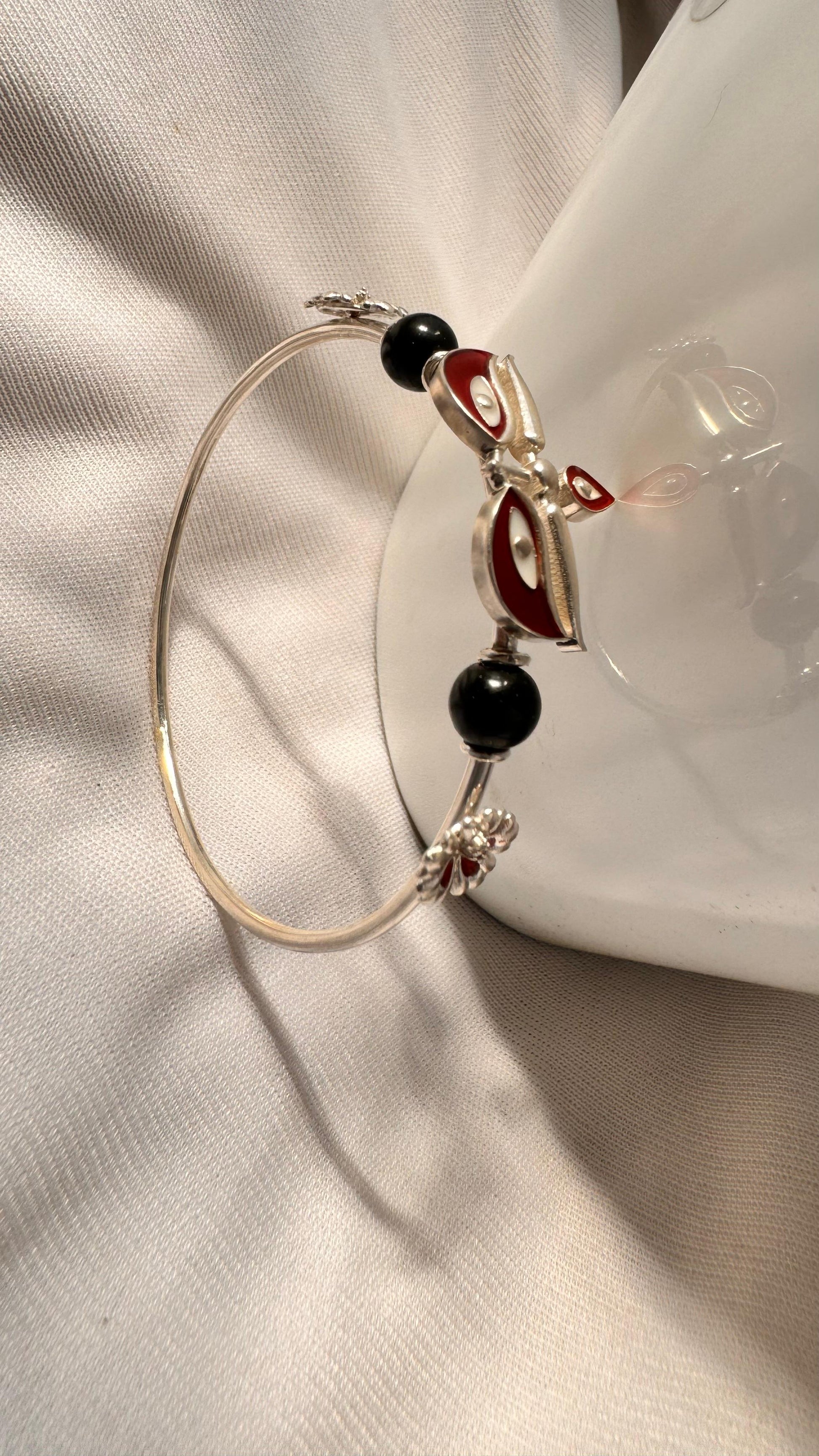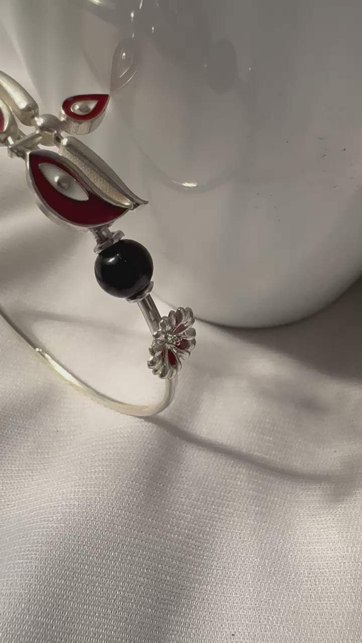 Expertly handcrafted and adorned with authentic nazariyan beads and hibiscus flowers, this sterling silver bangle pays homage to the powerful Boromaa. With a BIS-hallmark and certified 925 silver, it's a symbol of quality and craftsmanship.