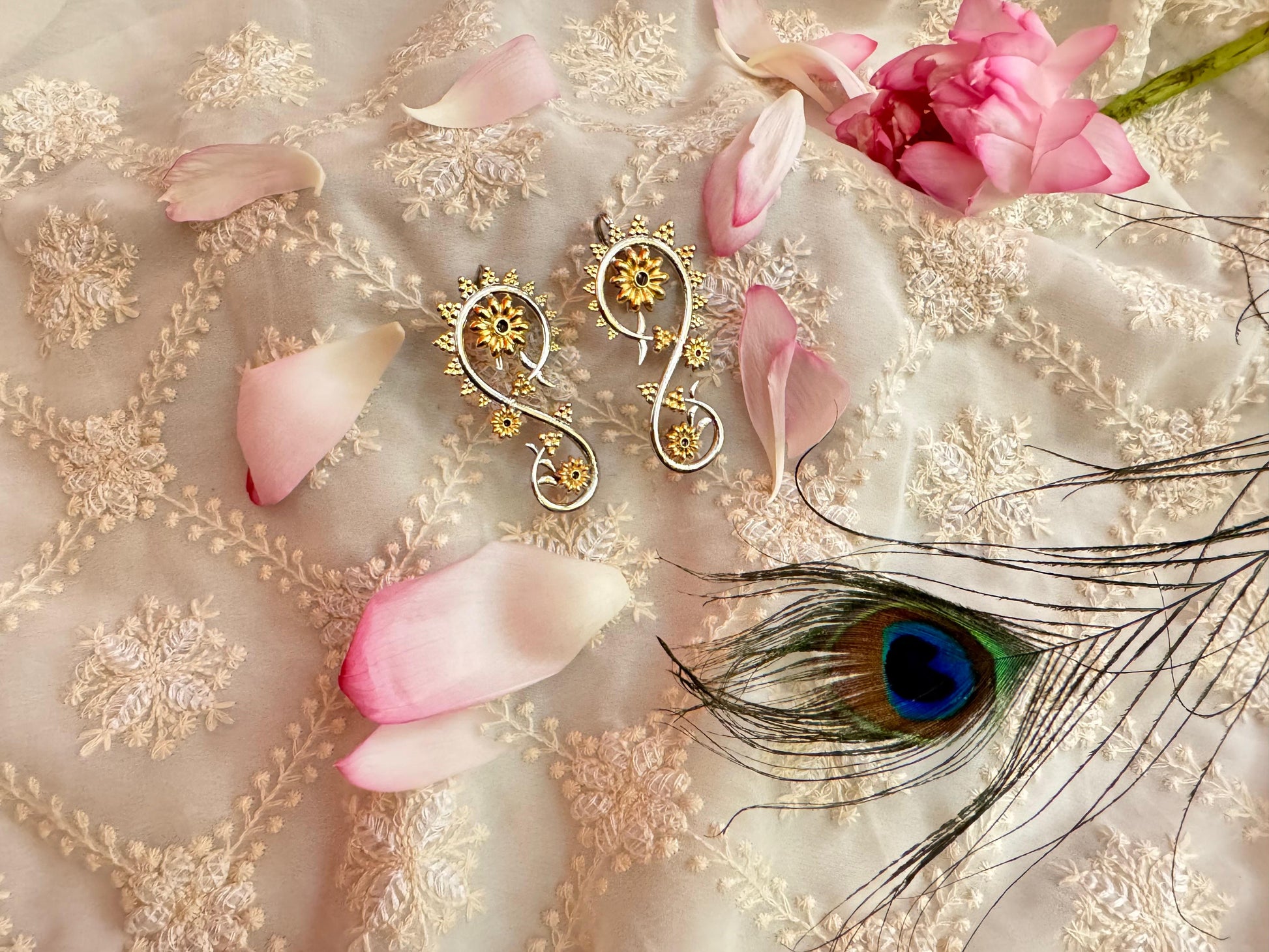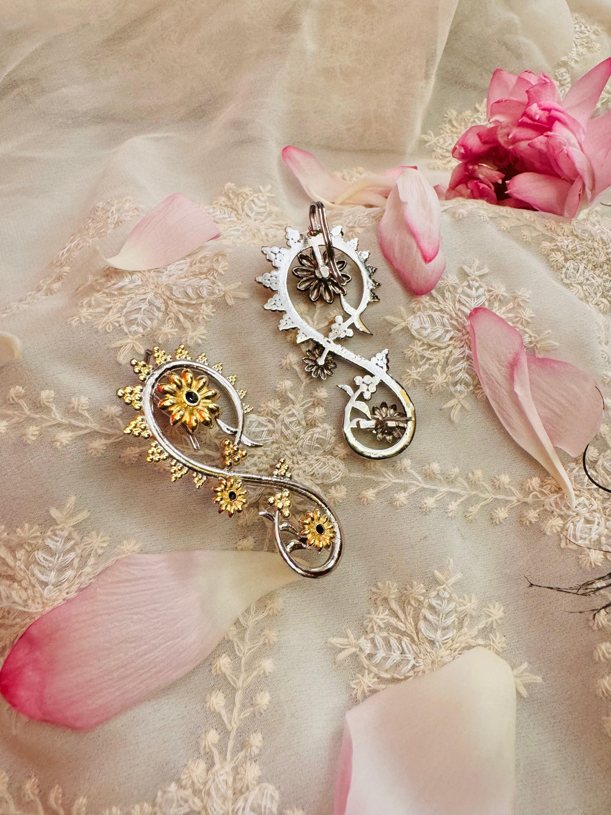 The Chandrava earring cum earcuff is a sophisticated piece of jewelry that embodies boldness, modernity, and effortless style. Handcrafted from BIS hallmarked 925 silver, this dual-tone accessory combines elegance with a contemporary edge, making it perfect for the discerning wearer. Its intricate detailing reflects expert craftsmanship, while the versatile design allows it to be worn either as a traditional earring or as a striking earcuff. Symbolizing the spirit of the next generation and modern India, this piece offers a timeless yet innovative statement to elevate any look with subtle royalty and refined grace.