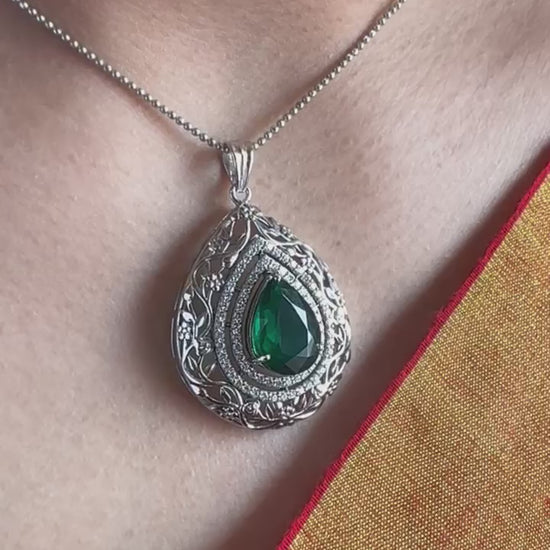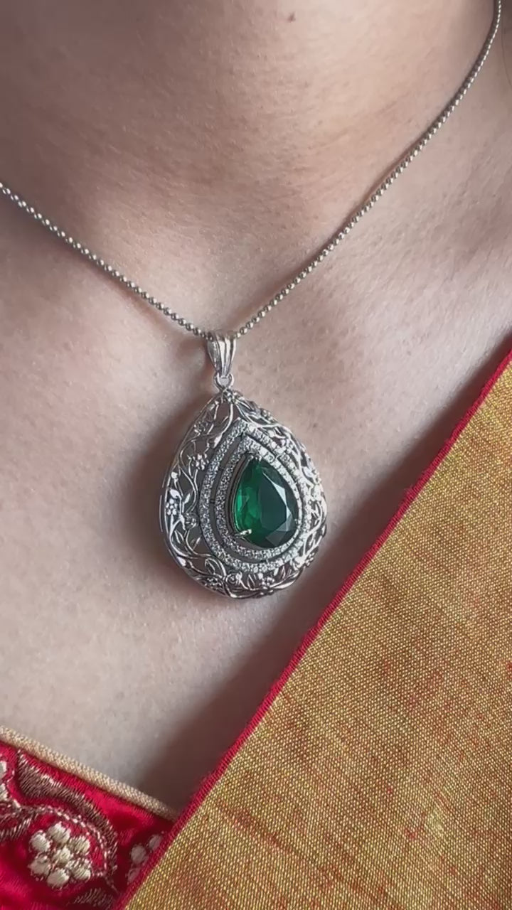 Expertly crafted with delicate precision and the utmost care, the Green stone droplet pendant boasts an elegant floral pattern that surrounds a captivating green stone. As if plucked from a single rain droplet, this pendant speaks for itself and adds a touch of grace to any outfit.