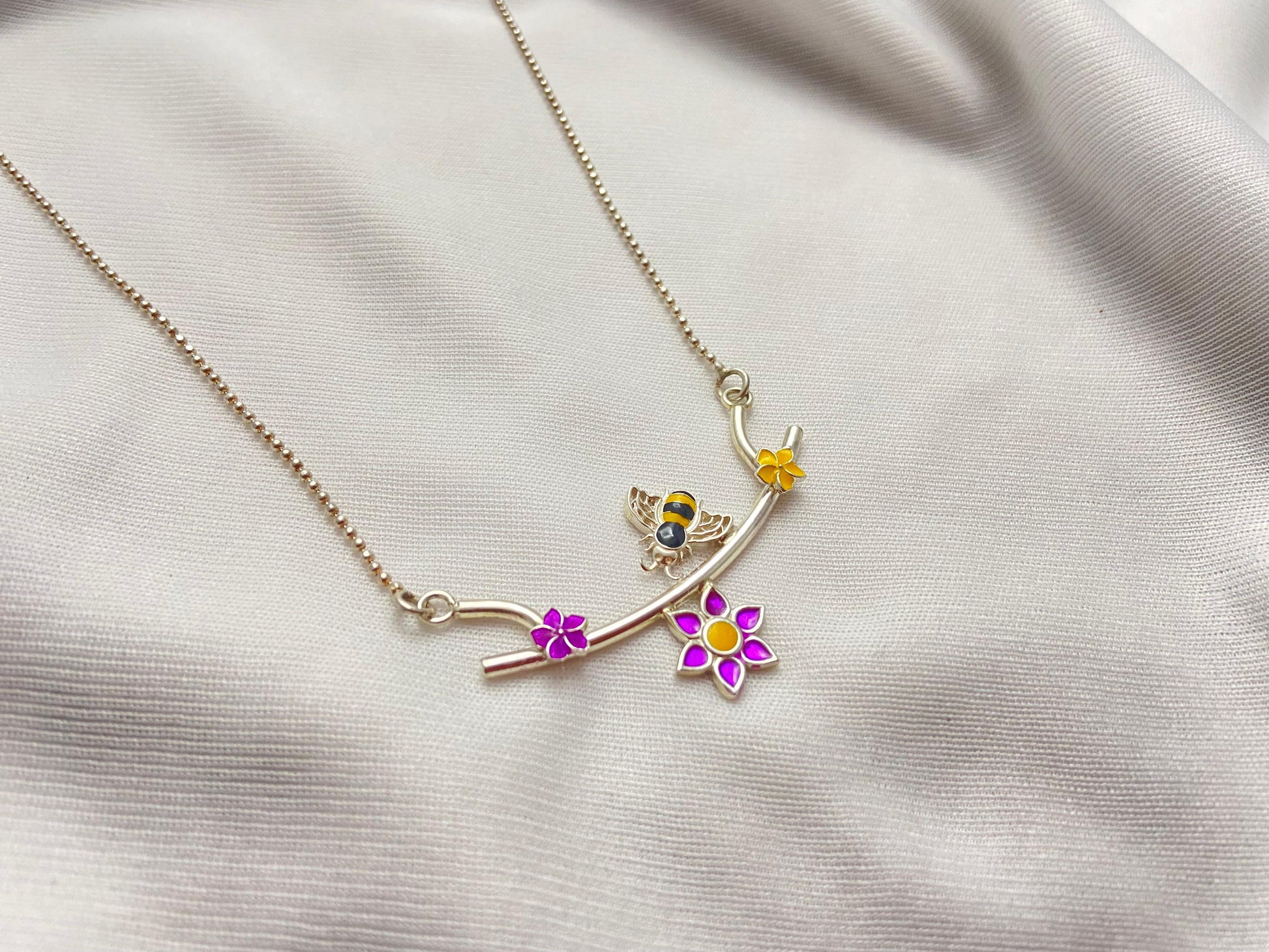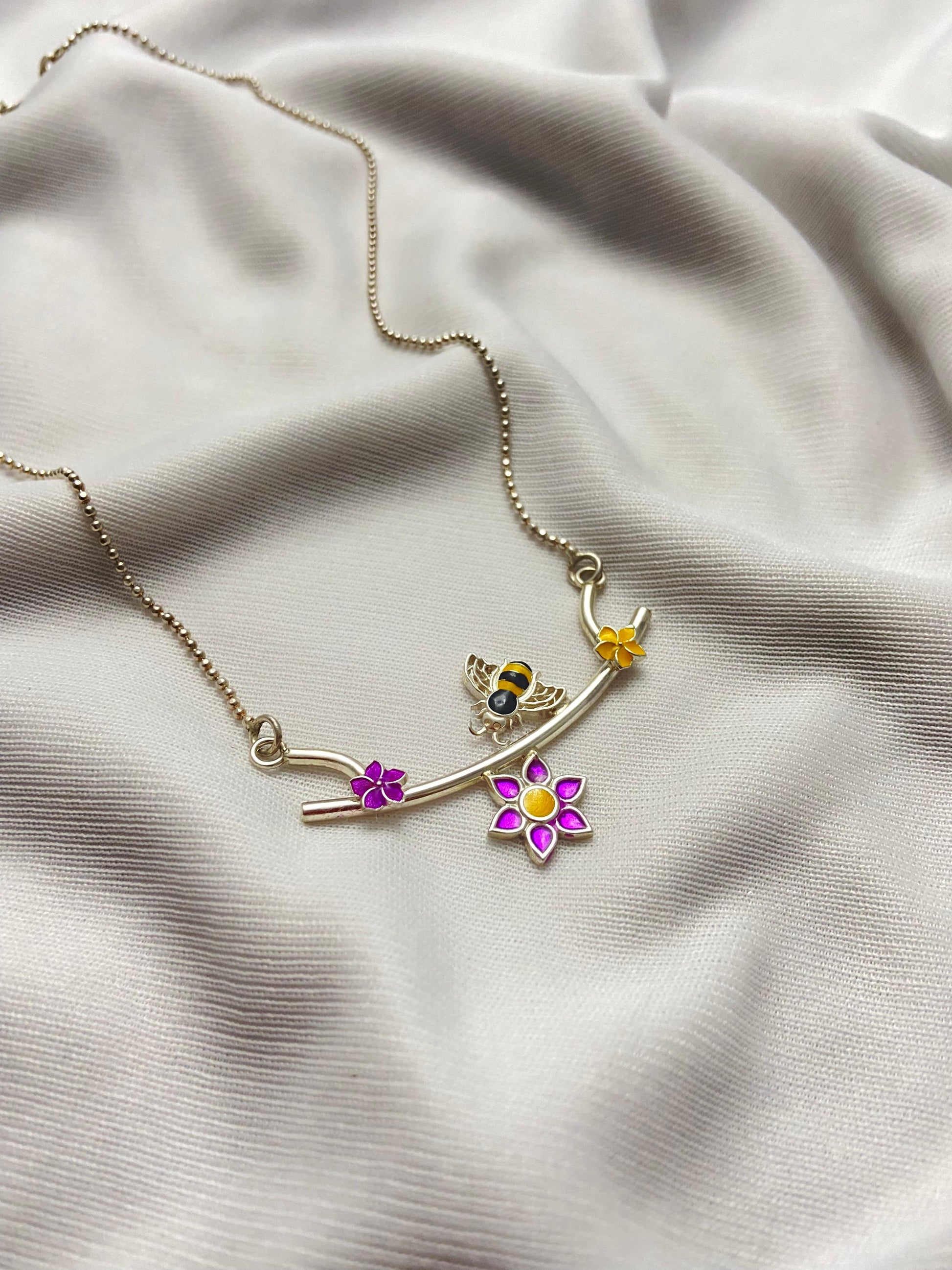 Expertly crafted and adorned with a stunning honeybee design, this necklace captures the serene beauty of nature in all its glory. Witness the magic of pollination in action as you wear this exquisite statement piece.