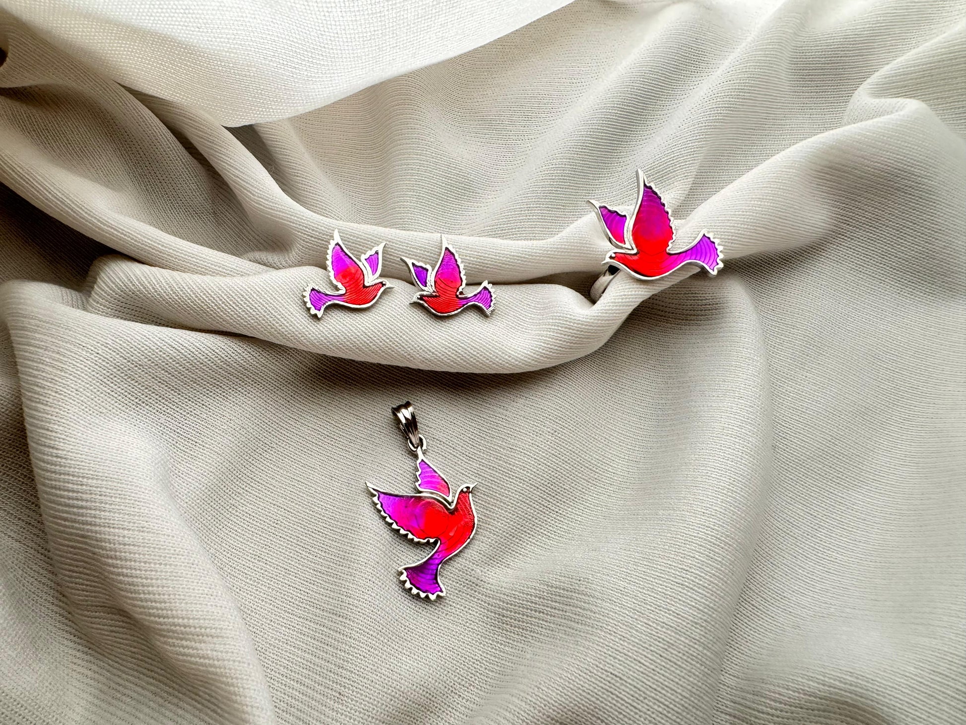 The combo includes: a bird pendant, a bird stud earring pair and a bird ring (adjustable).