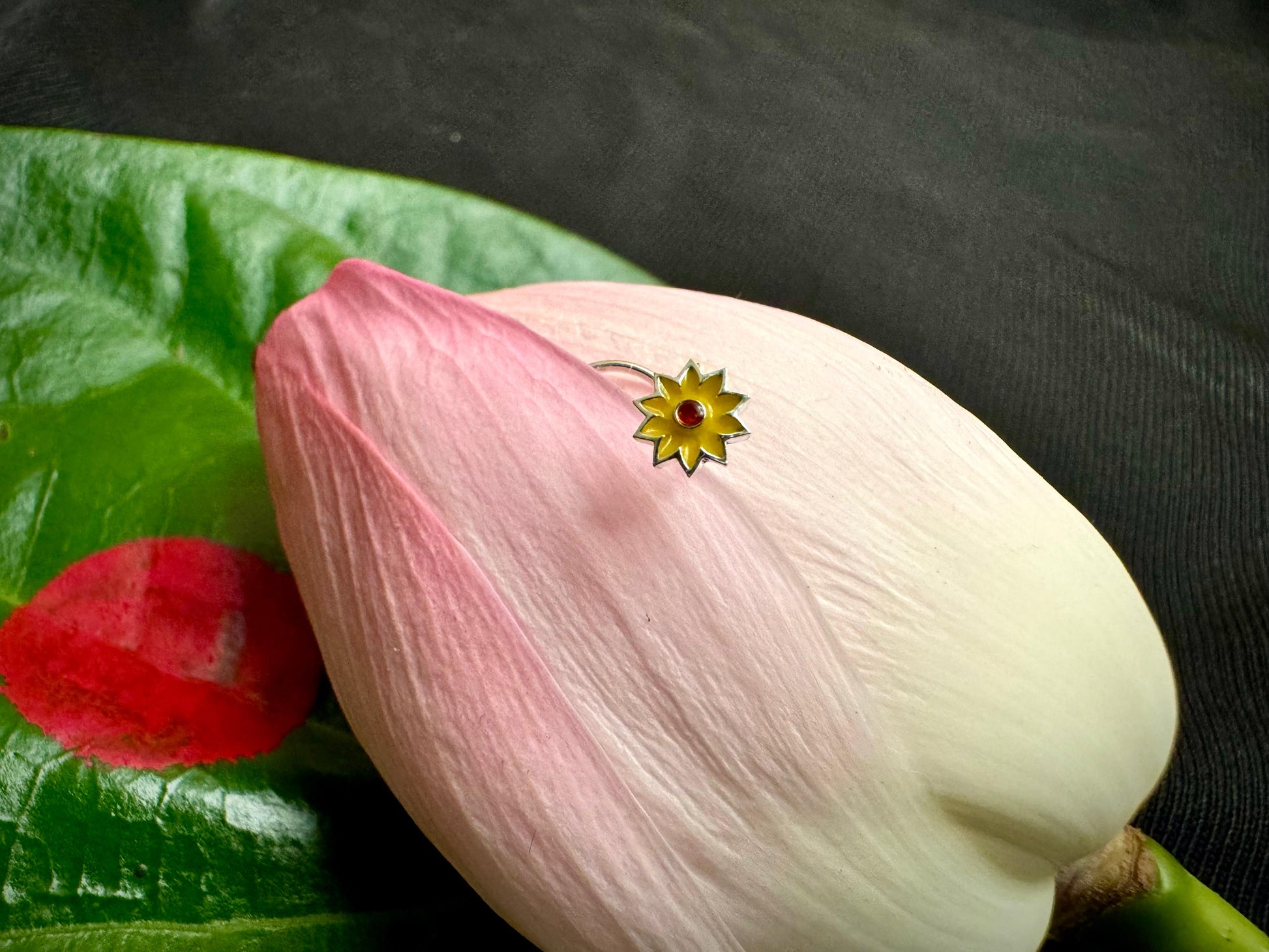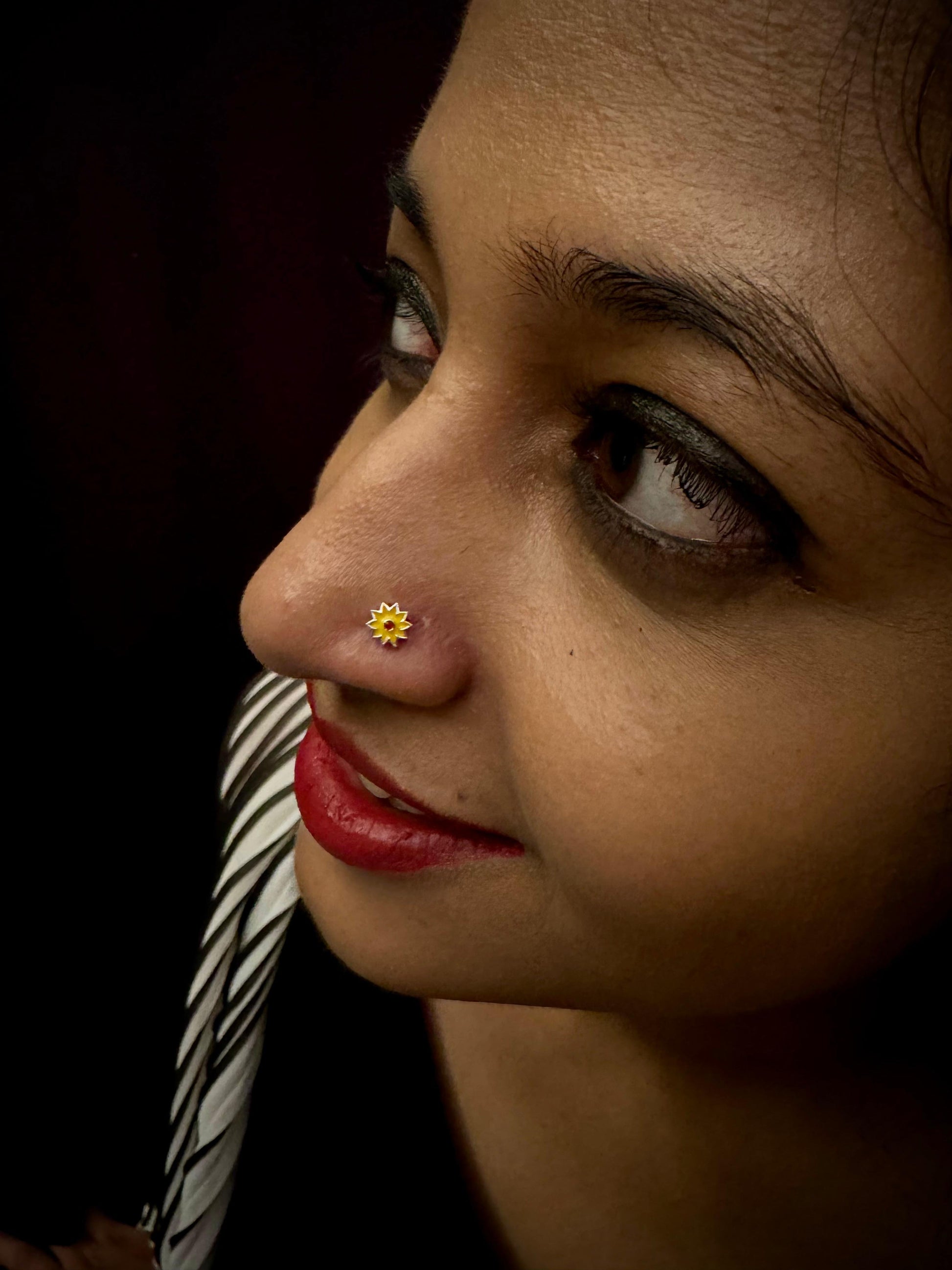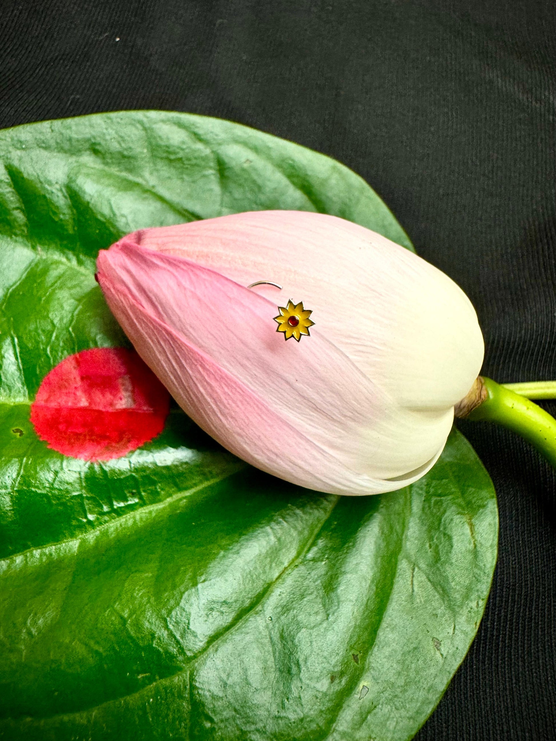 This marigold nosepin draws inspiration from the traditional genda phool, a symbol of celebration and festivity in Indian culture. The design features vivid yellow petals surrounding a striking red center, reminiscent of a radiant miniature sun that brings warmth and joyful energy to any ensemble. Crafted with precision in BIS hallmarked 925 silver, this nosepin combines authentic craftsmanship with durability and hypoallergenic qualities. Its vibrant and elegant appearance makes it an excellent accessory for festive occasions, enhancing your look with a touch of cultural heritage and timeless charm.