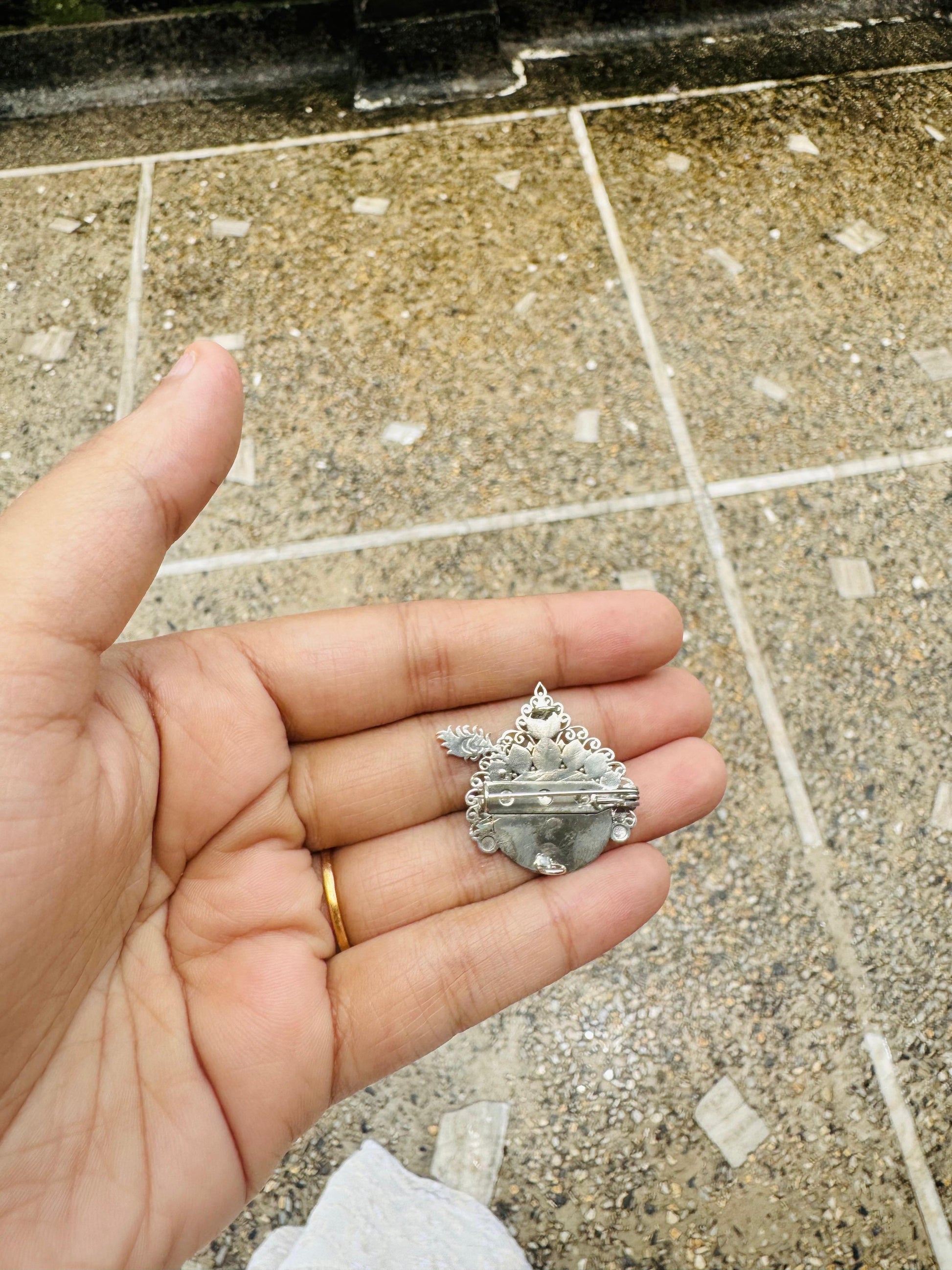 This charming “Nathkhat Jagannath” brooch in 925 BIS hallmarked silver features a playful, smiling face of Lord Jagannath adorned with colorful enamel detailing and a peacock feather crown. The intricate craftsmanship and vibrant accents capture divine innocence, making it both a spiritual symbol and a unique statement of devotion.