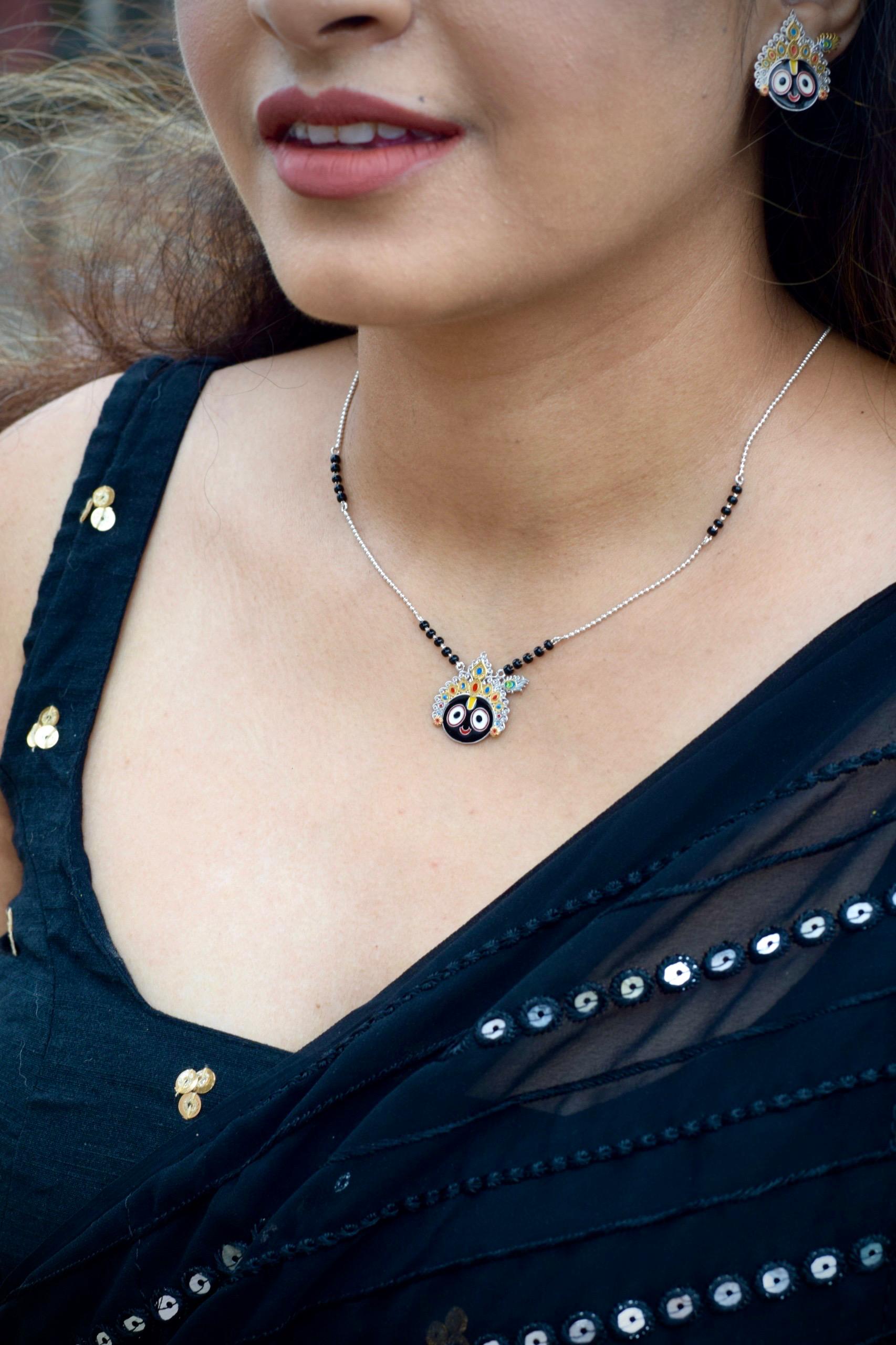 This charming “Nathkhat Jagannath” mangalsutra in 925 BIS hallmarked silver features a playful, smiling face of Lord Jagannath adorned with colorful enamel detailing and a peacock feather crown. The intricate craftsmanship and vibrant accents capture divine innocence, making it both a spiritual symbol and a unique statement of devotion.