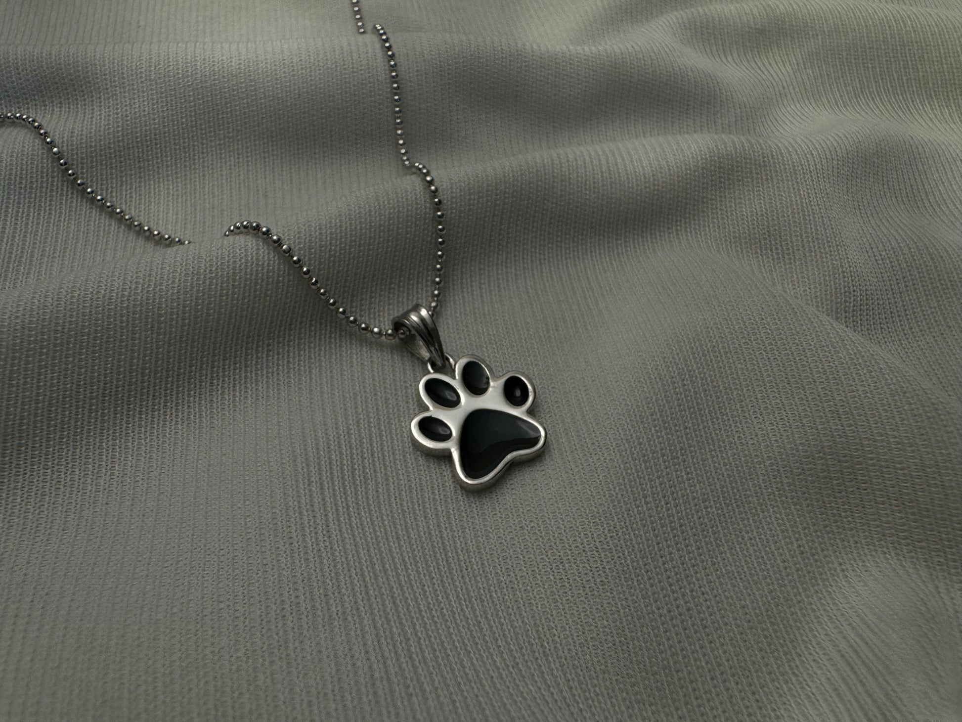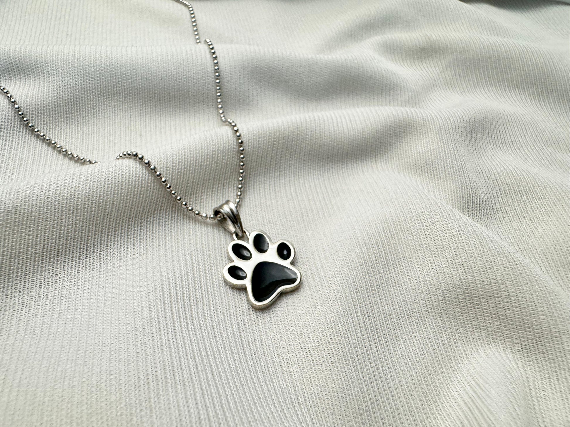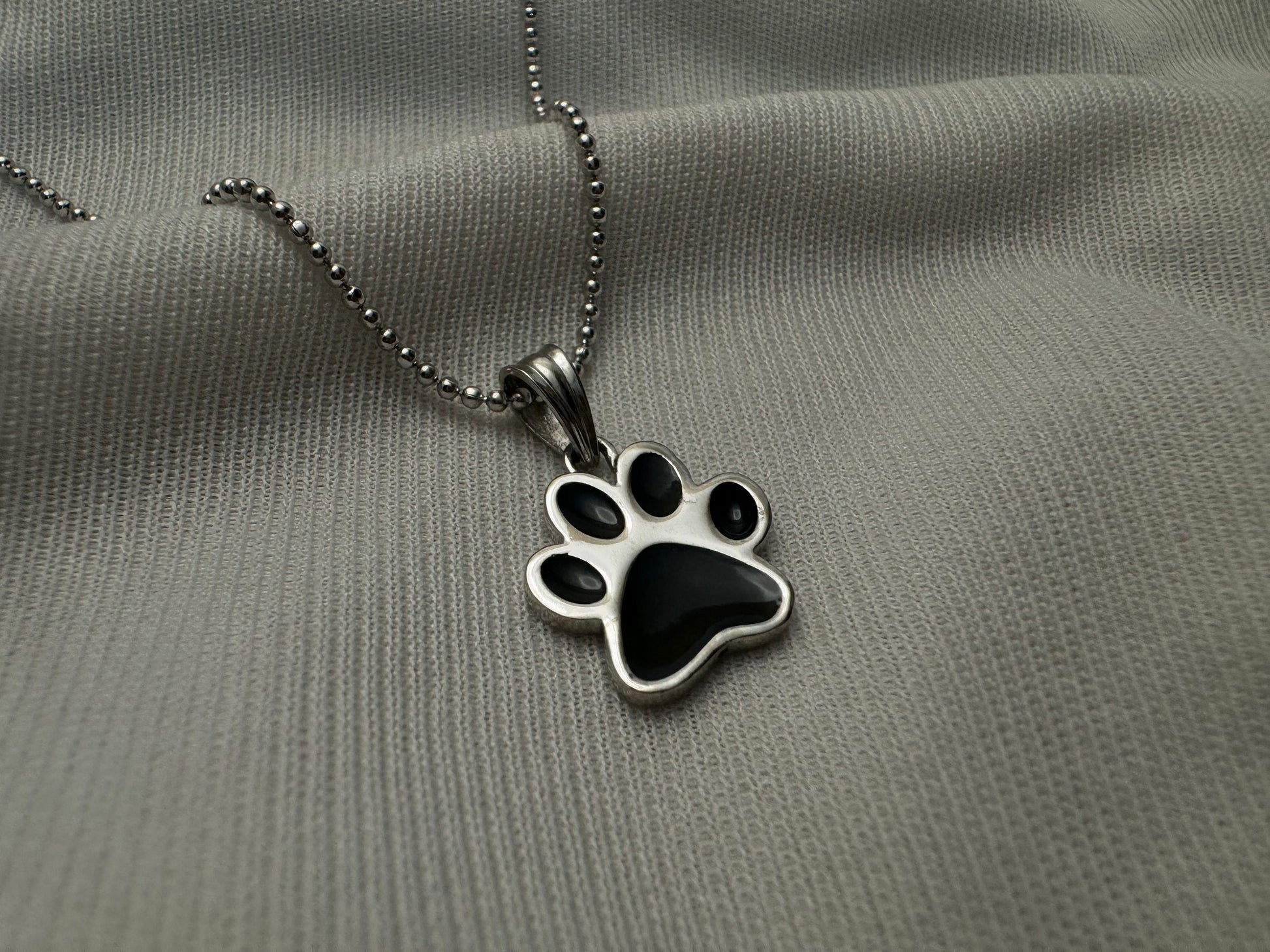 Paw-some pendant's signature design features a charming paw motif in black enamel, adding a touch of playfulness .