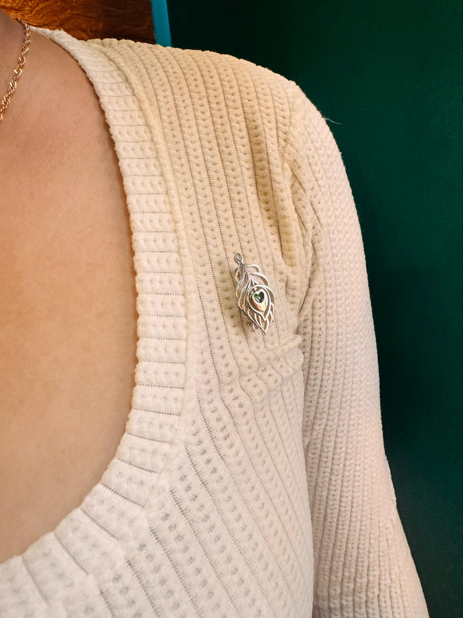 This elegant peacock feather brooch is handcrafted in 925 silver, featuring a graceful silhouette and a vibrant green-blue eye at its heart. A symbol of beauty and pride, it adds a divine charm to any outfit—perfect for festive wear or everyday elegance with a touch of tradition.