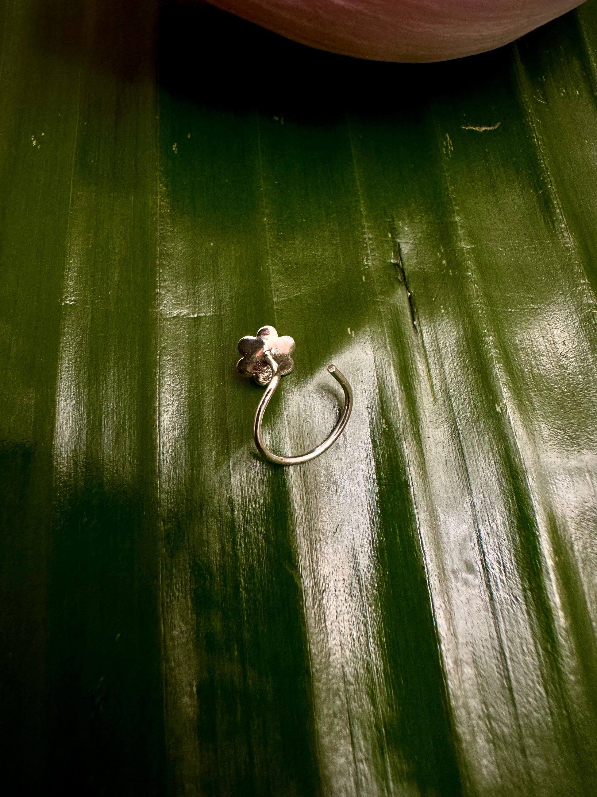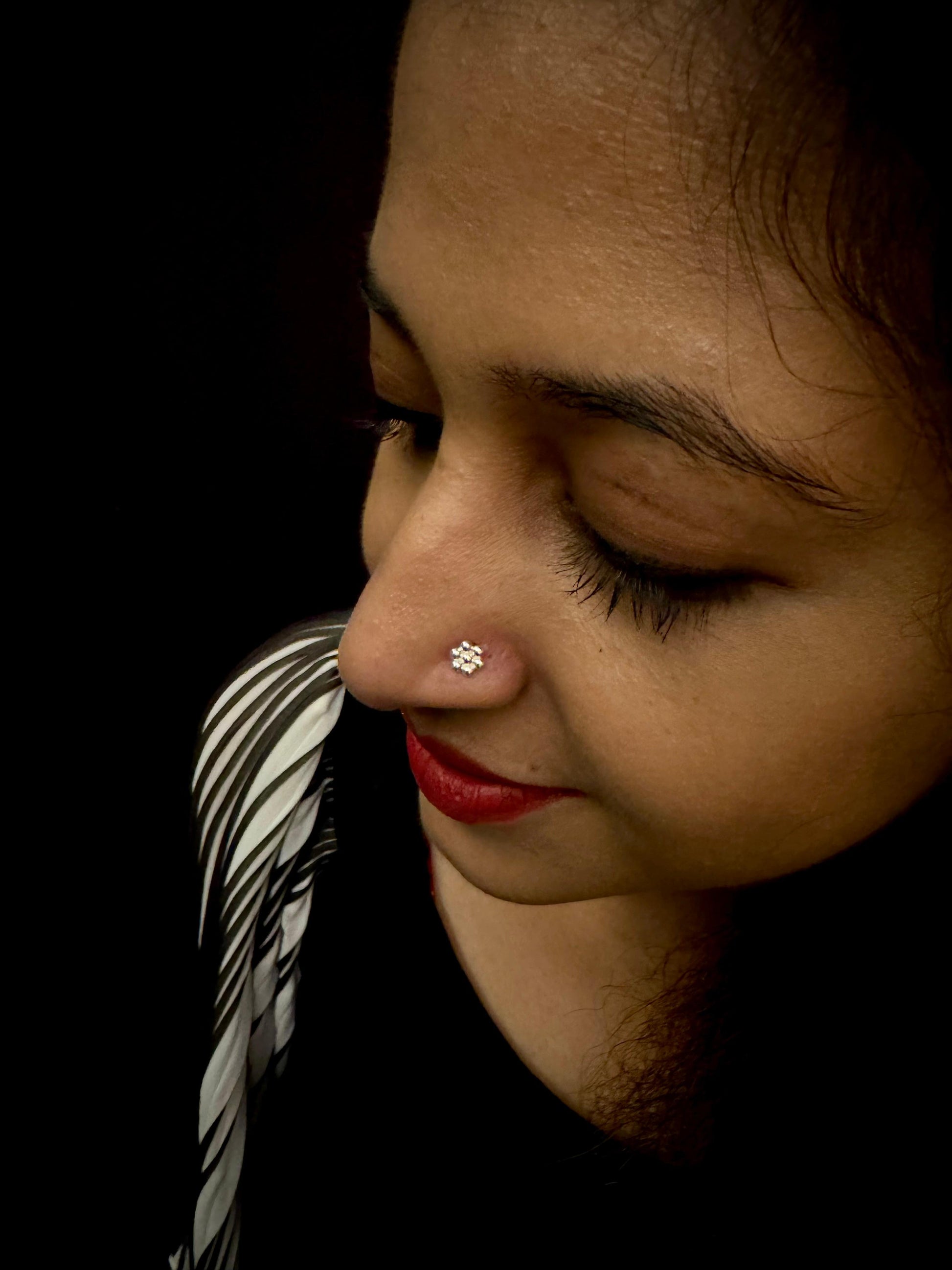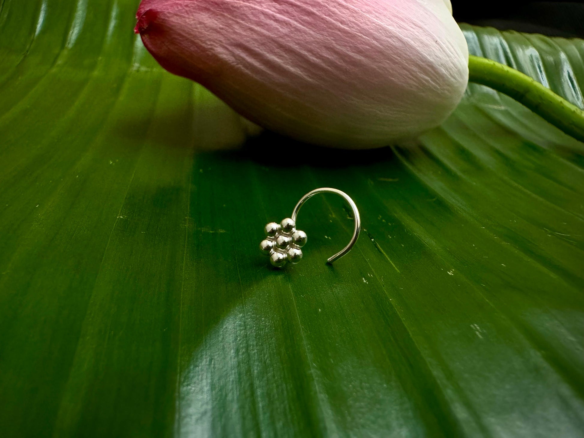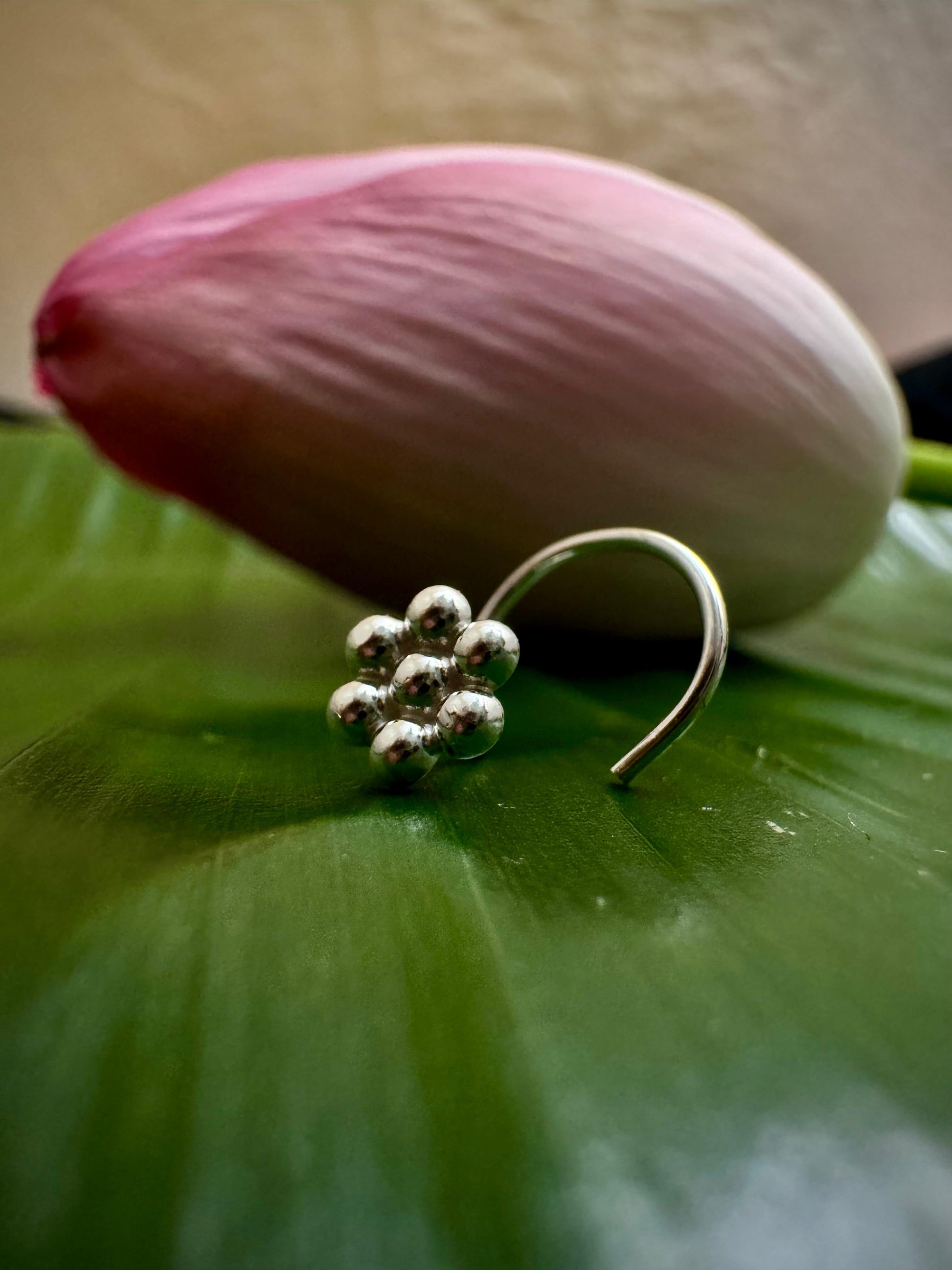 Shashphul, derived from Sanskrit meaning "six-petal flower," is beautifully represented in this nosepin design. It features six delicate silver beads arranged to form a subtle floral cluster, balancing minimalism with a timeless elegance. The nosepin carries a refined charm that harmonizes traditional aesthetics with contemporary style, making it a versatile accessory for everyday wear or special occasions. Crafted meticulously from BIS hallmarked 925 silver, it ensures both authenticity and quality. This piece not only enhances your look but also reflects a rich cultural heritage with a modern sensibility.