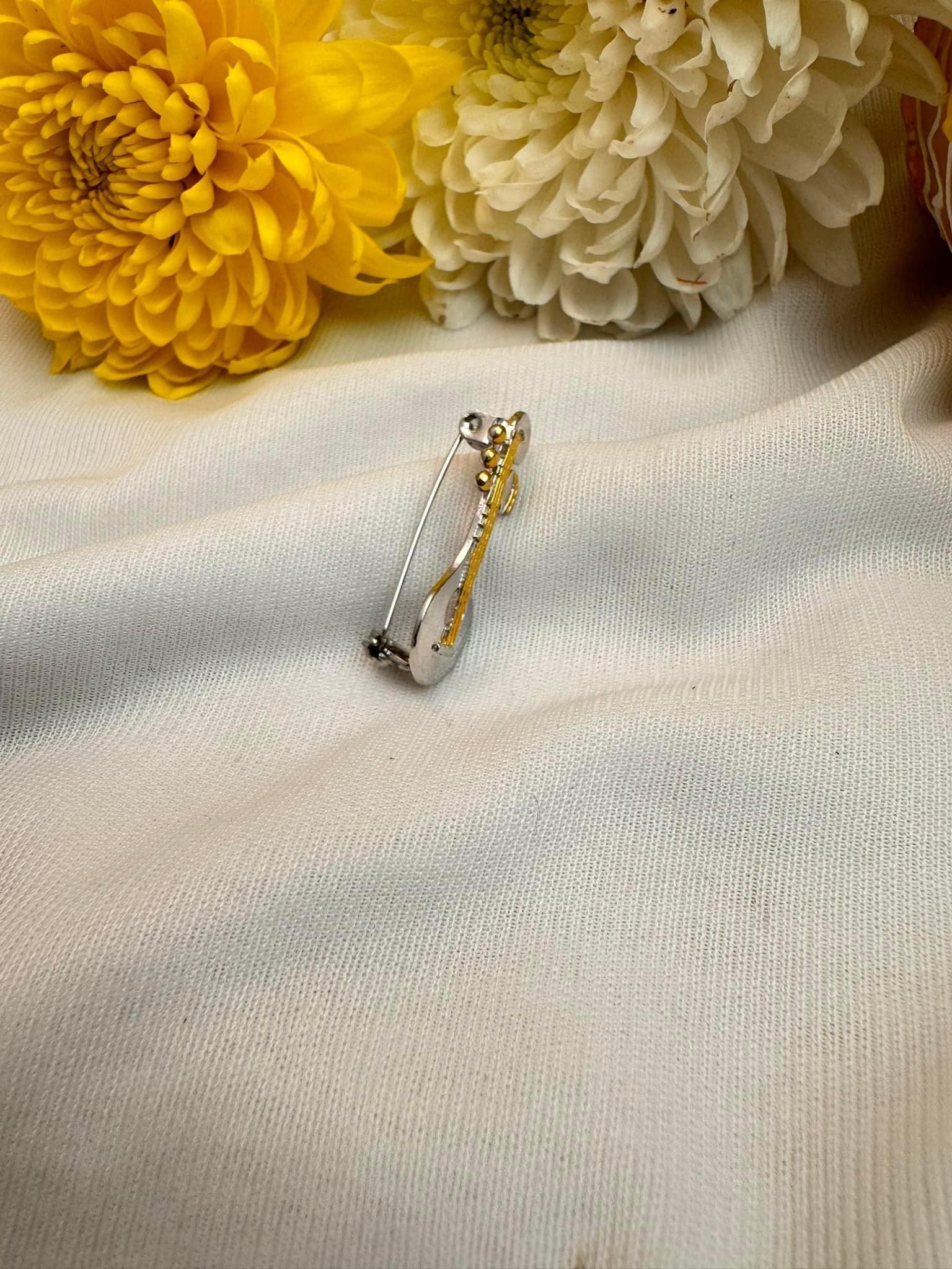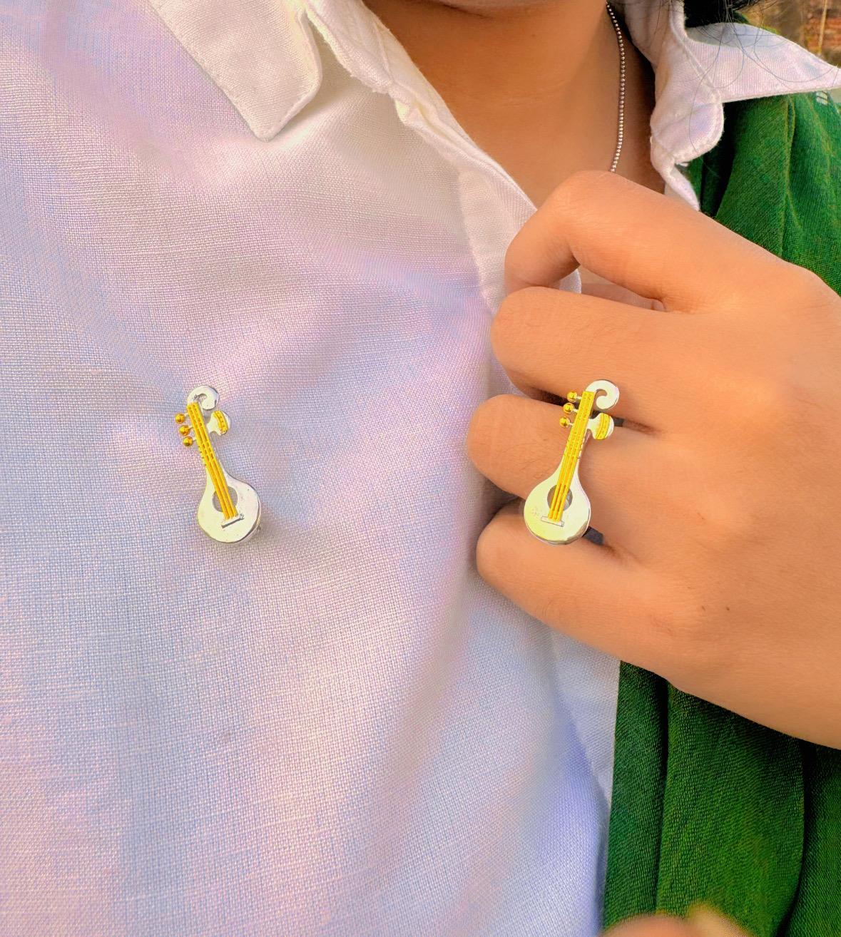 Expand your knowledge and creativity with the Veena brooch. Allow the wisdom and inspiration of Goddess Saraswati to enhance your inner artist and ignite your creative spark. The dual tone design adds a touch of sophistication and elegance to this symbol of harmony and balance. Embrace the power of knowledge and continue to strive for more with this exquisite piece.